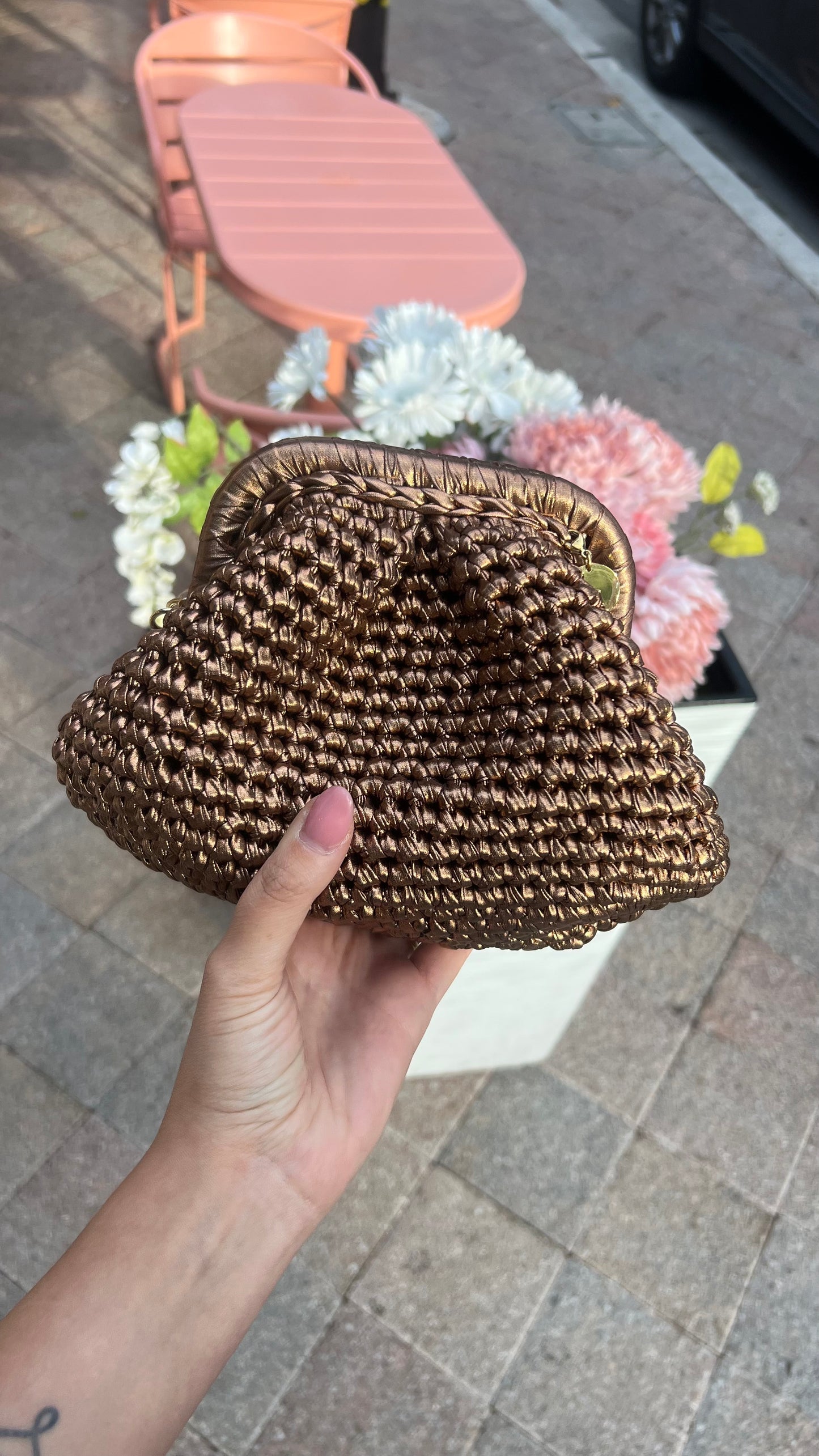 A handmade stylish Crochet Bag, made with metallic yarn. Perfect to carry all your essentials for a date night, holiday event or special event! Our metallic clutch bag is the perfect statement piece and will elevate your outfit!